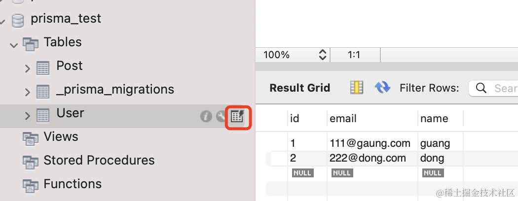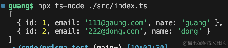 test1();创建 PrismaClient,用 create 方法创建了 2 个 user,然后查询出来。