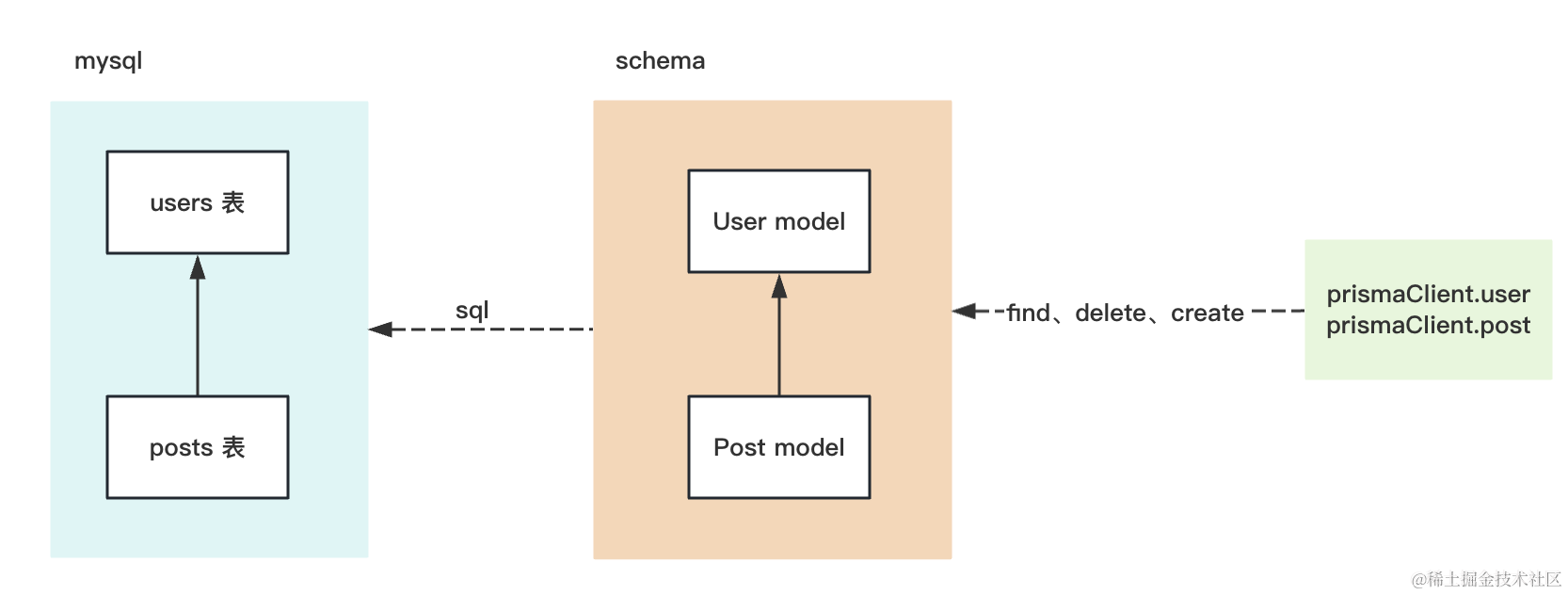 它是把表映射成了 DSL 里的 model,然后编译这个 DSL 会生成 prismaClient 的代码,之后就可以调用它的 find、delete、create 等 api 来做 CRUD 了: