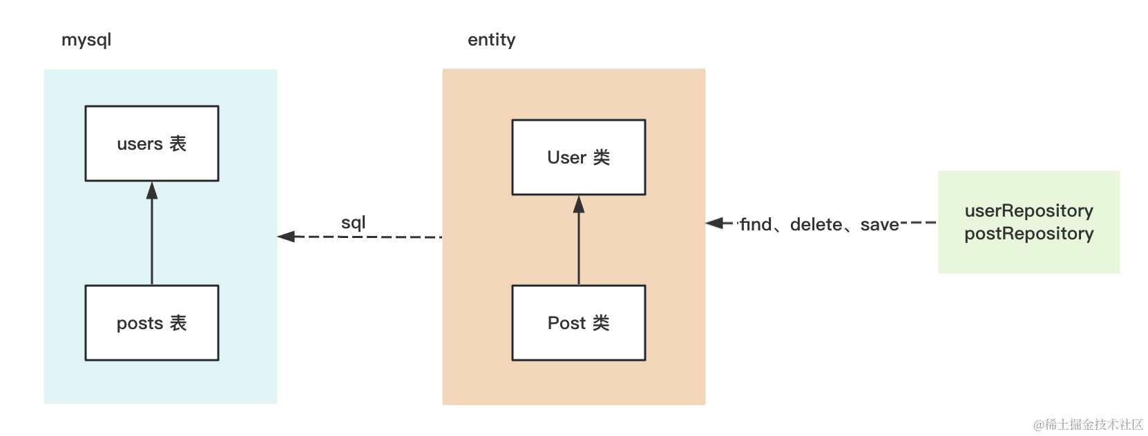 完成 entity 和表的映射之后,你只要调用 userRepository 和 postRepository 的 find、delete、save 等 api,typeorm 会自动生成对应的 sql 语句并执行。