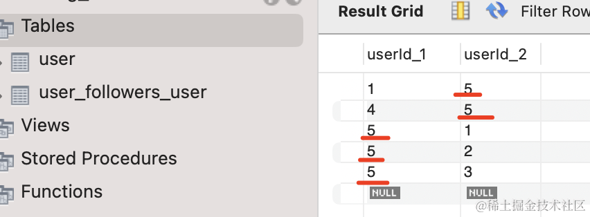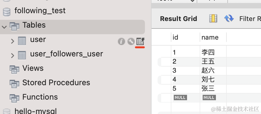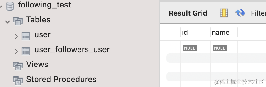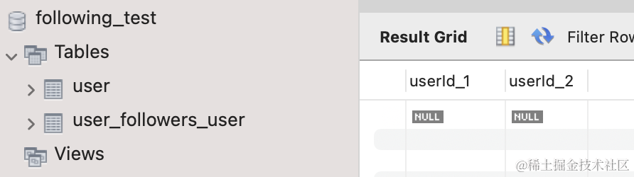 在 mysql workbench 里可以看到 user 表和 user_followers_user 中间表
