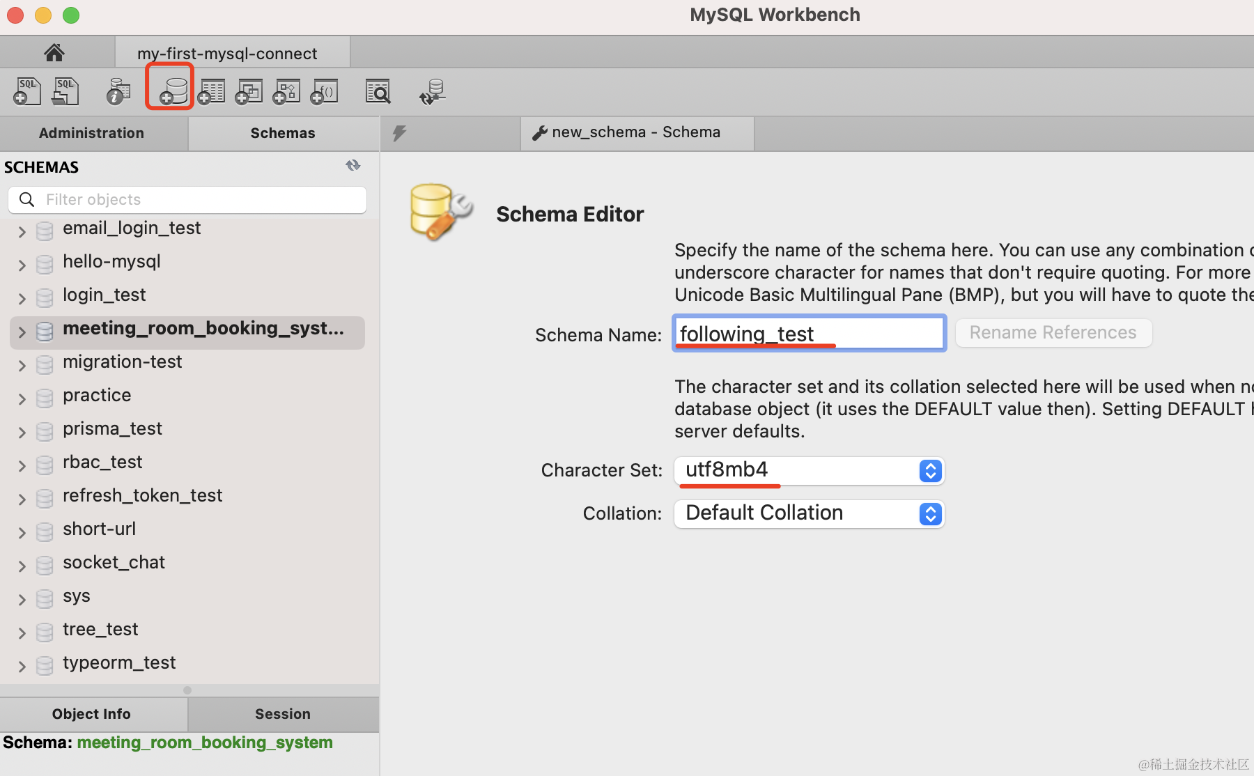 export class AppModule {}在 mysql workbench 里创建 following_test 数据库: