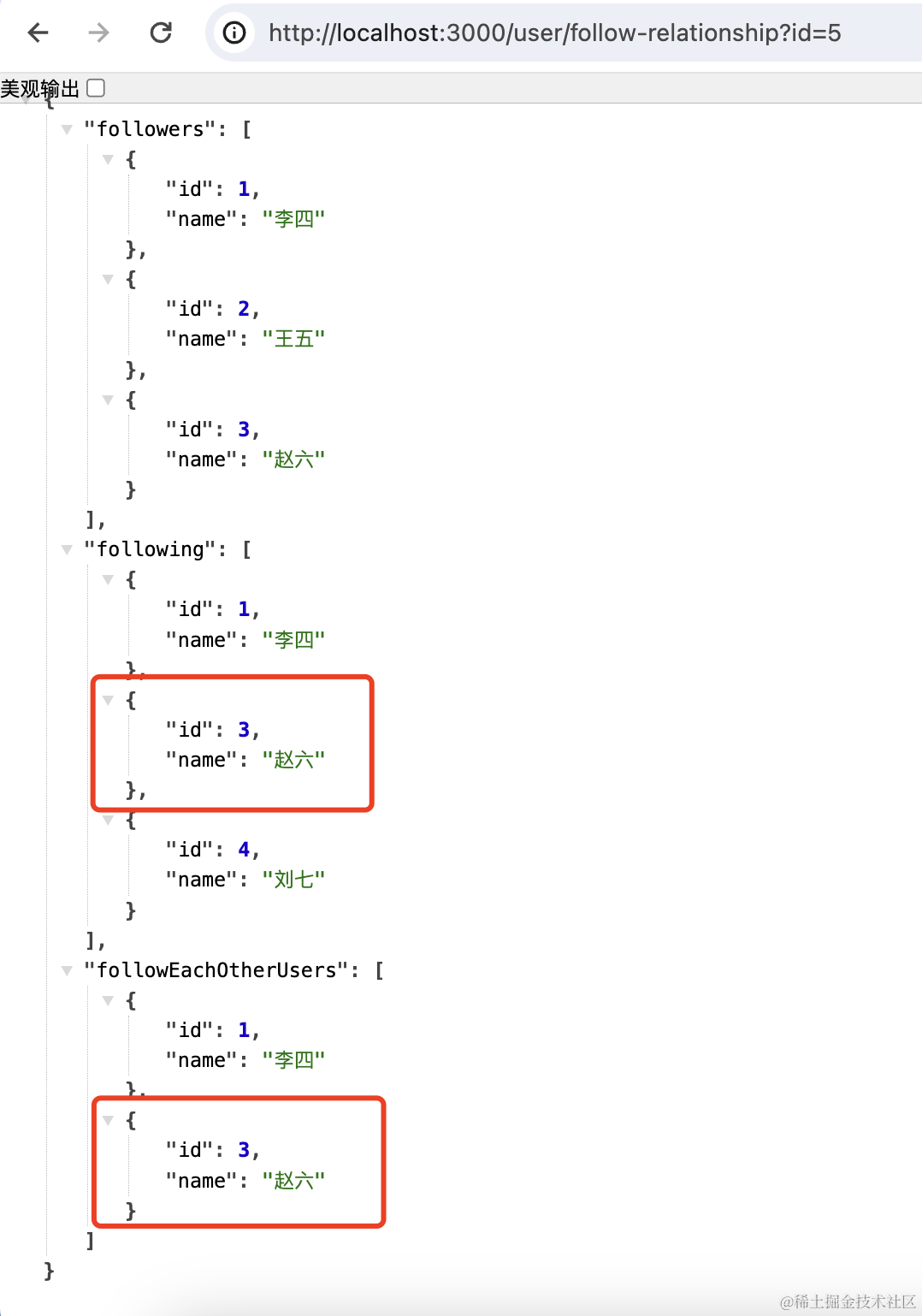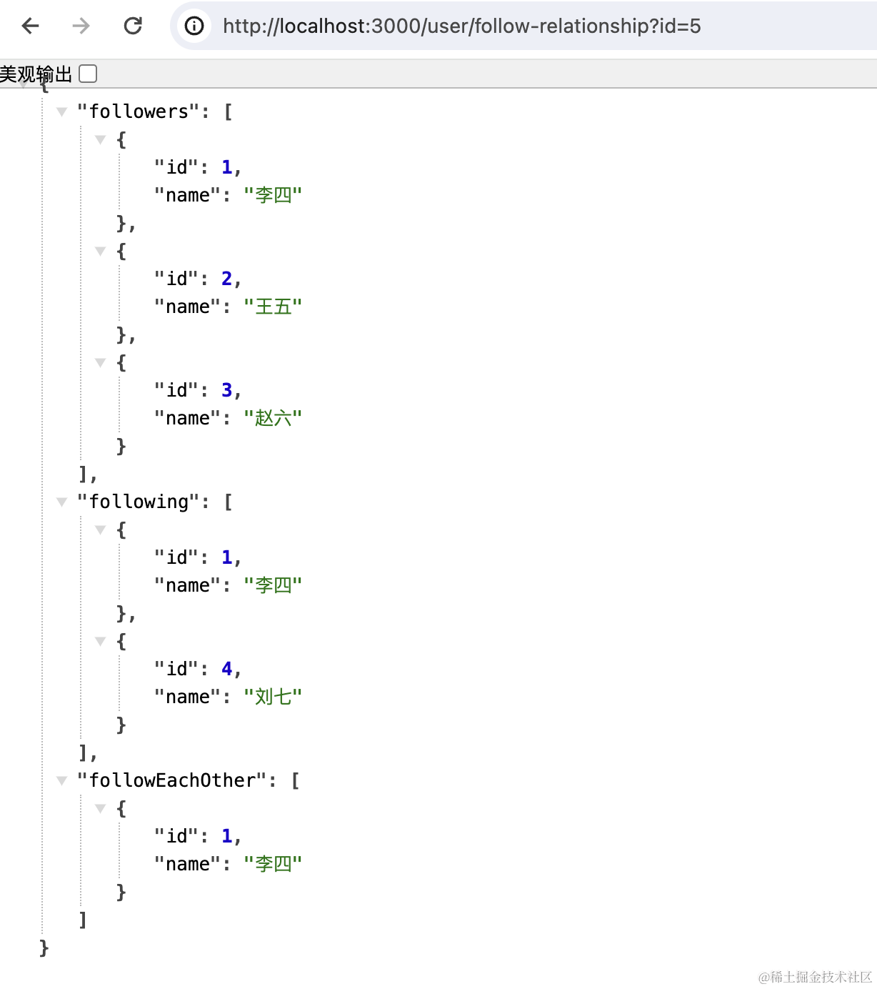 最后把 followers、following 还有求出来的相互关注的关系返回。