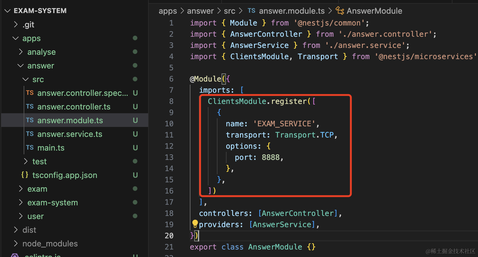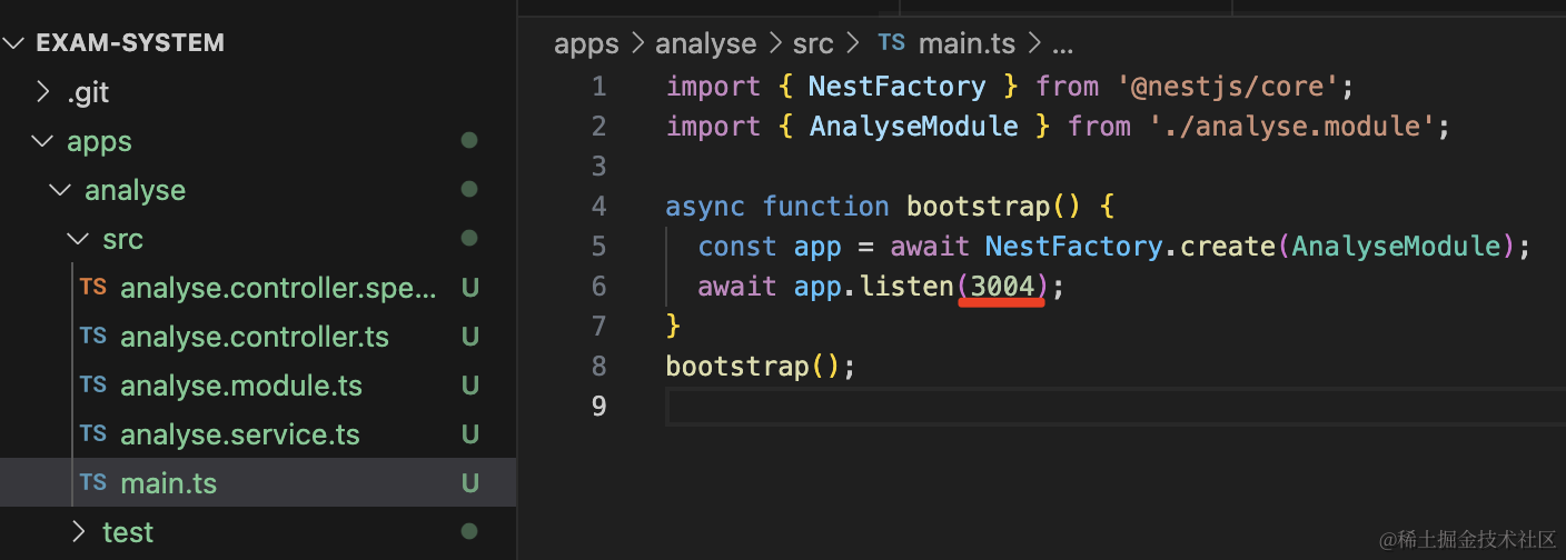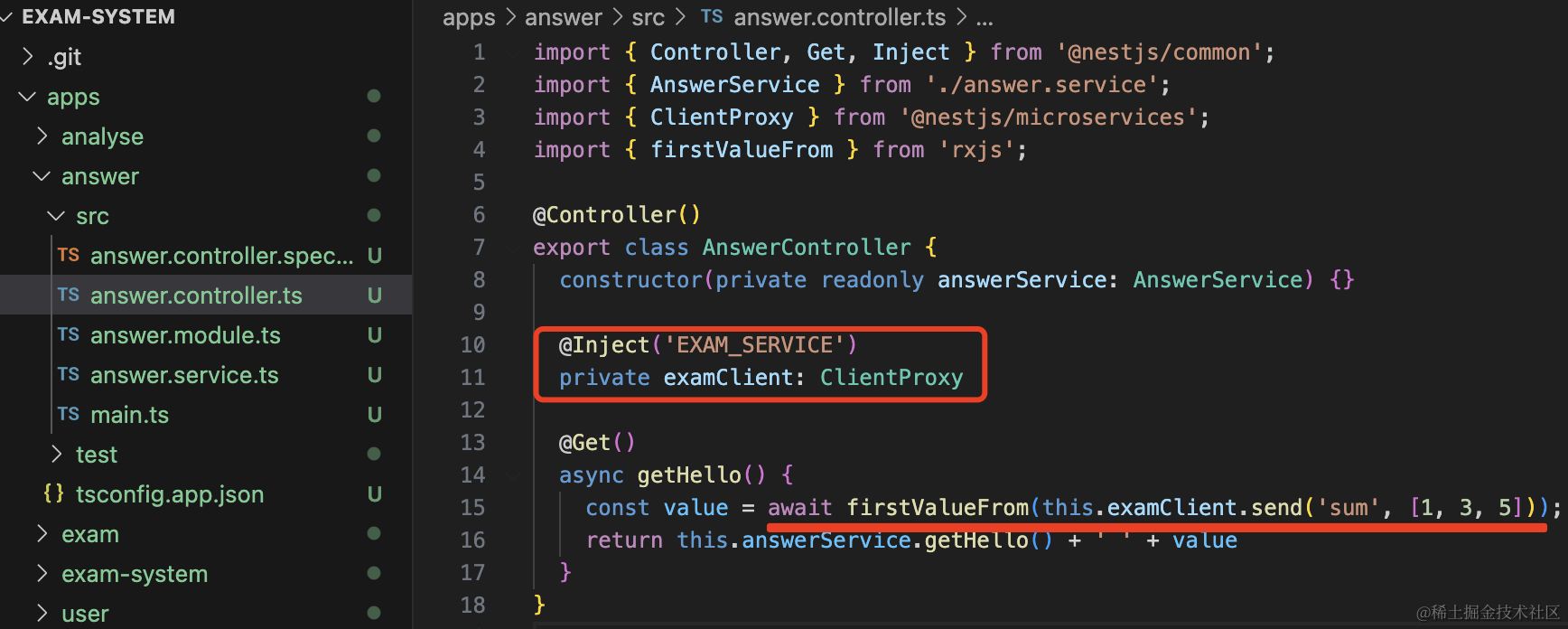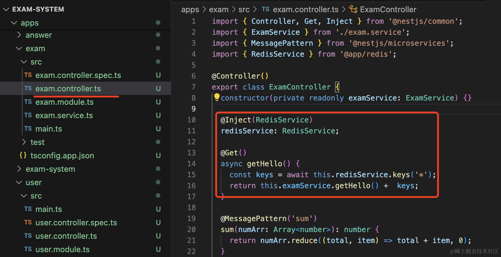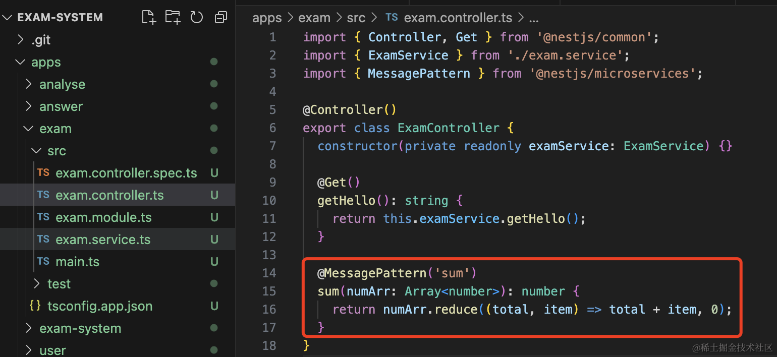 npm install @nestjs/microservices --save然后改下 exam 微服务,添加一个消息处理函数: