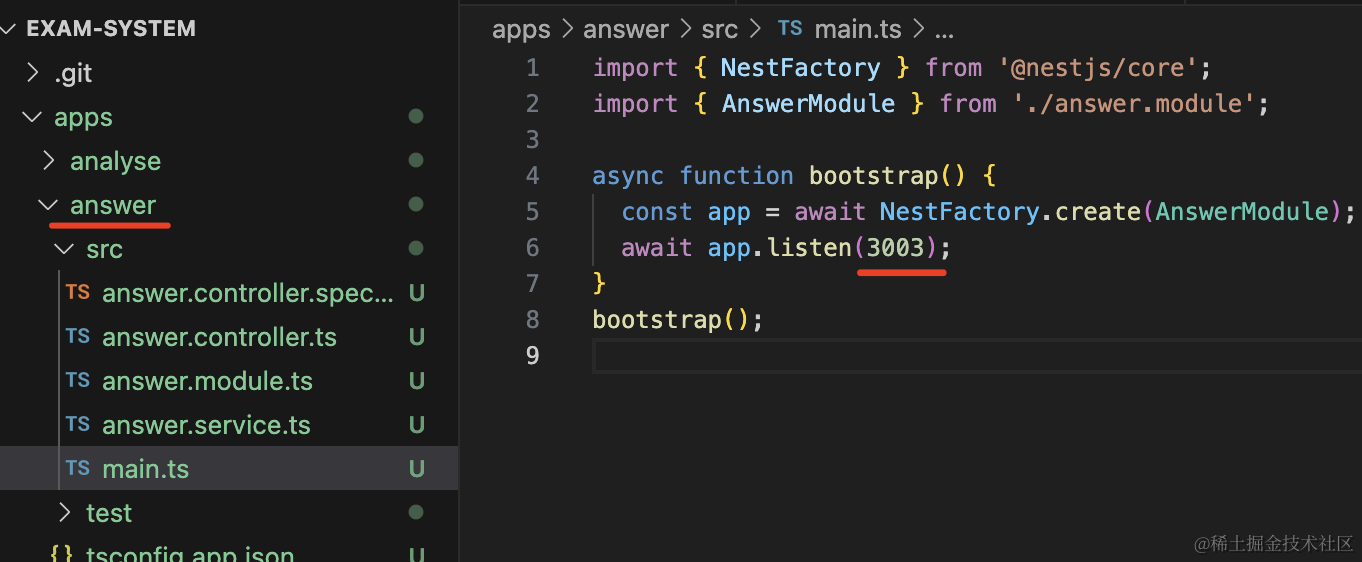 我们改下 user、exam、answer、analyse 的服务的启动端口,分别改为 3001、3002、3003、3004