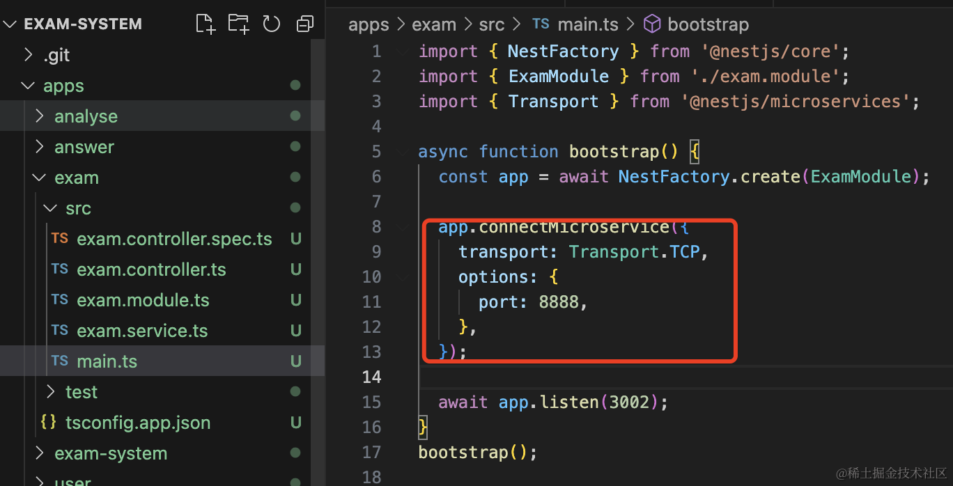 app.startAllMicroservices();exam 服务暴露了 3002 的 HTTP 服务,现在用 connectMicroservice 就是再暴露 8888 的 TCP 服务。