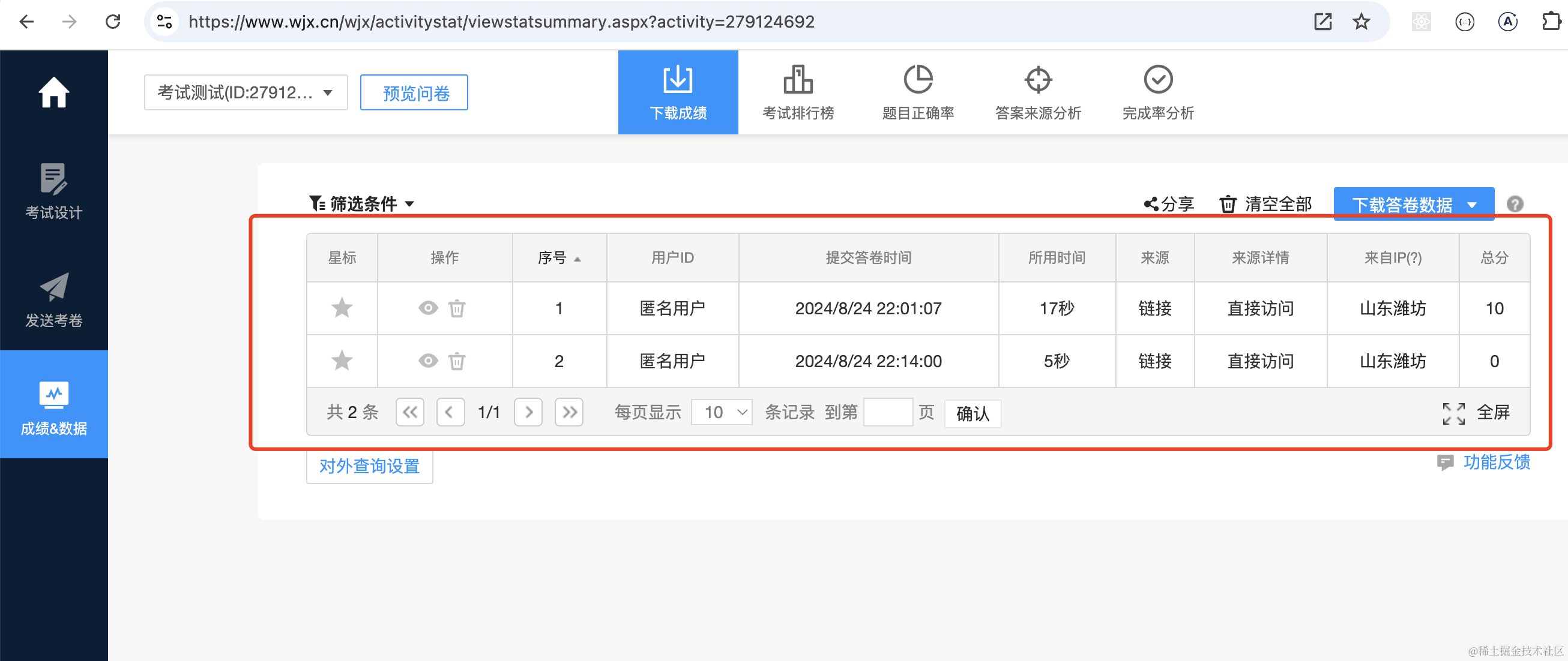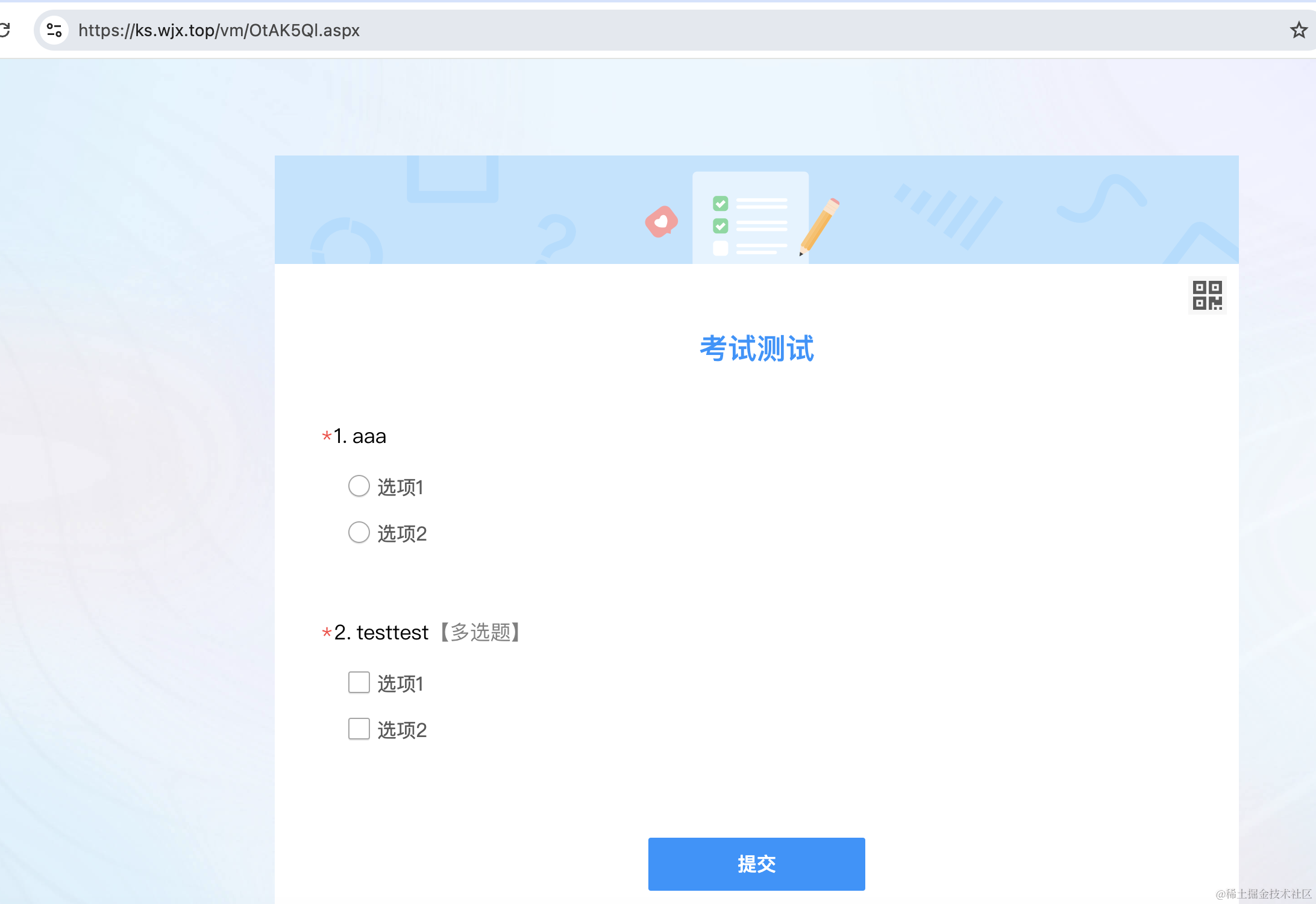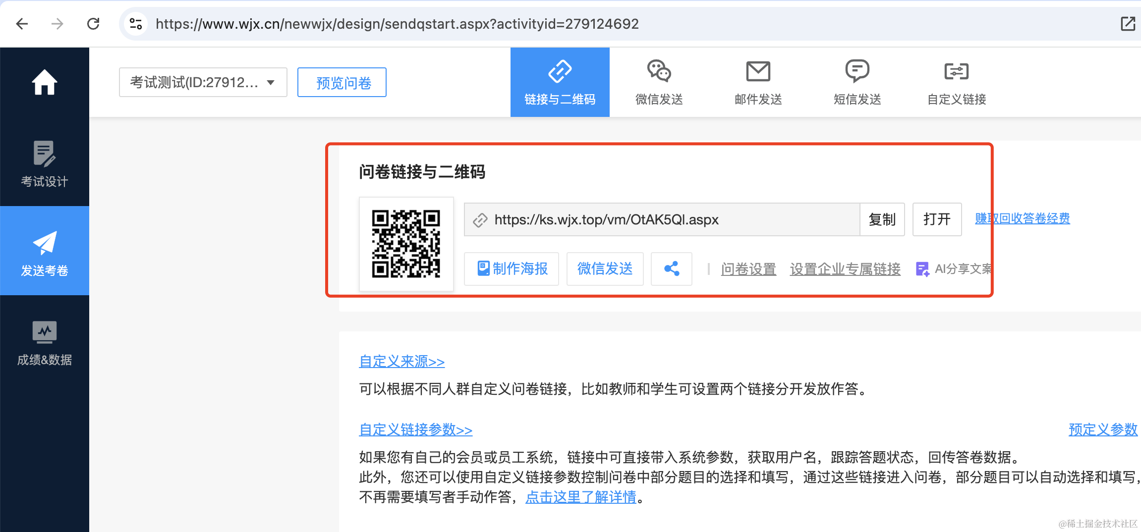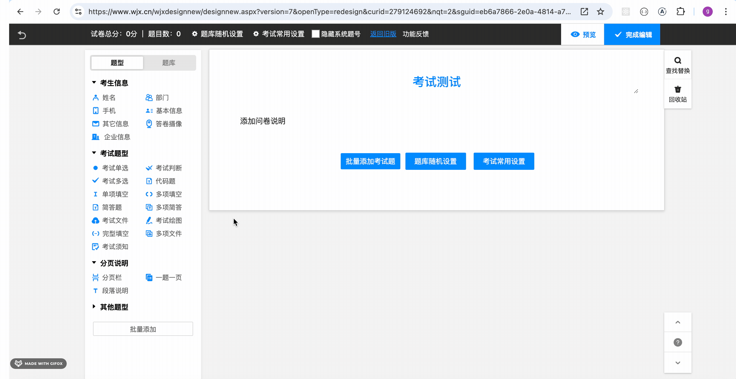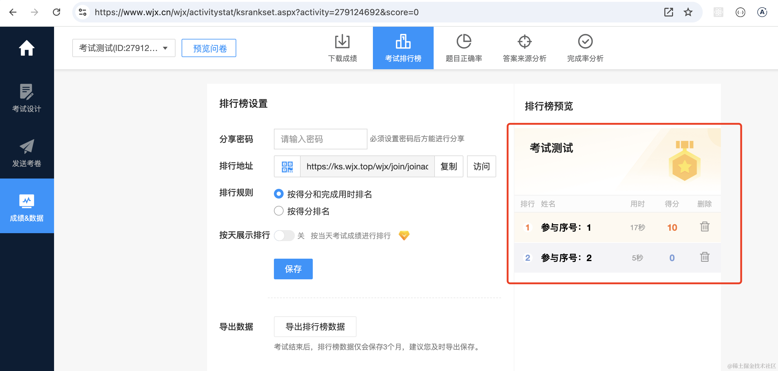 编辑完考试可以生成链接,打开链接答题后就会保存提交的答案。