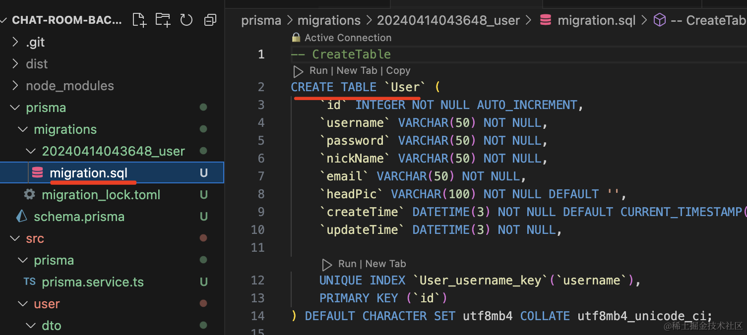 这时就生成了迁移文件,包含创建 user 表的 sql 语句:
