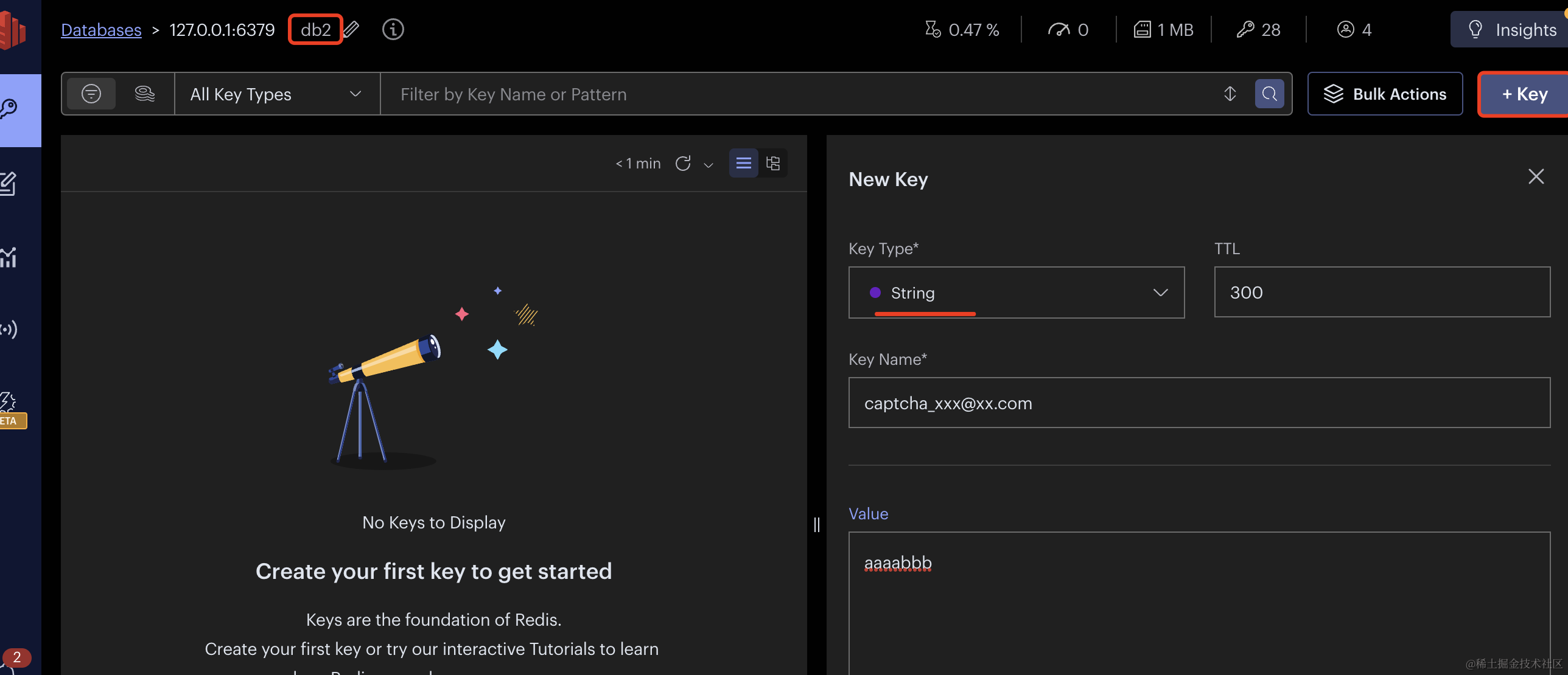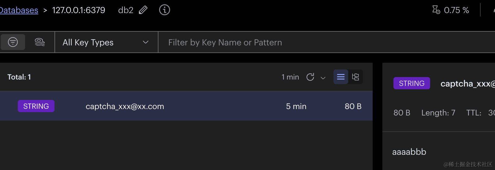 因为还没实现发送邮箱验证码的逻辑,这里我们手动在 redis 添加一个 key: