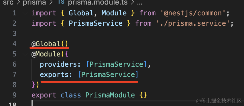 然后把 PrismaService 导出,并且设置 PrismaModule 为全局模块: