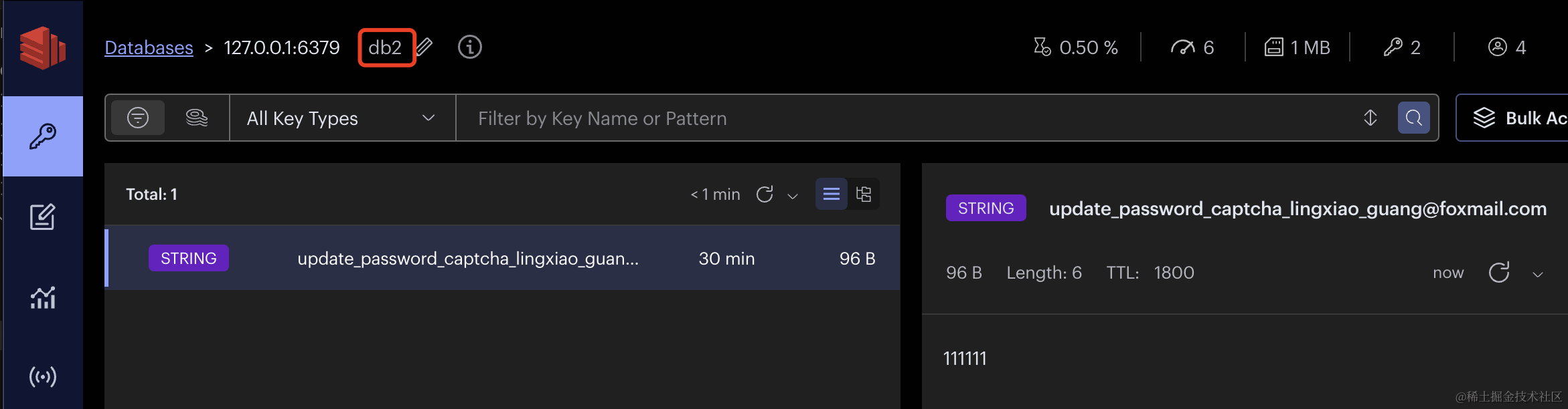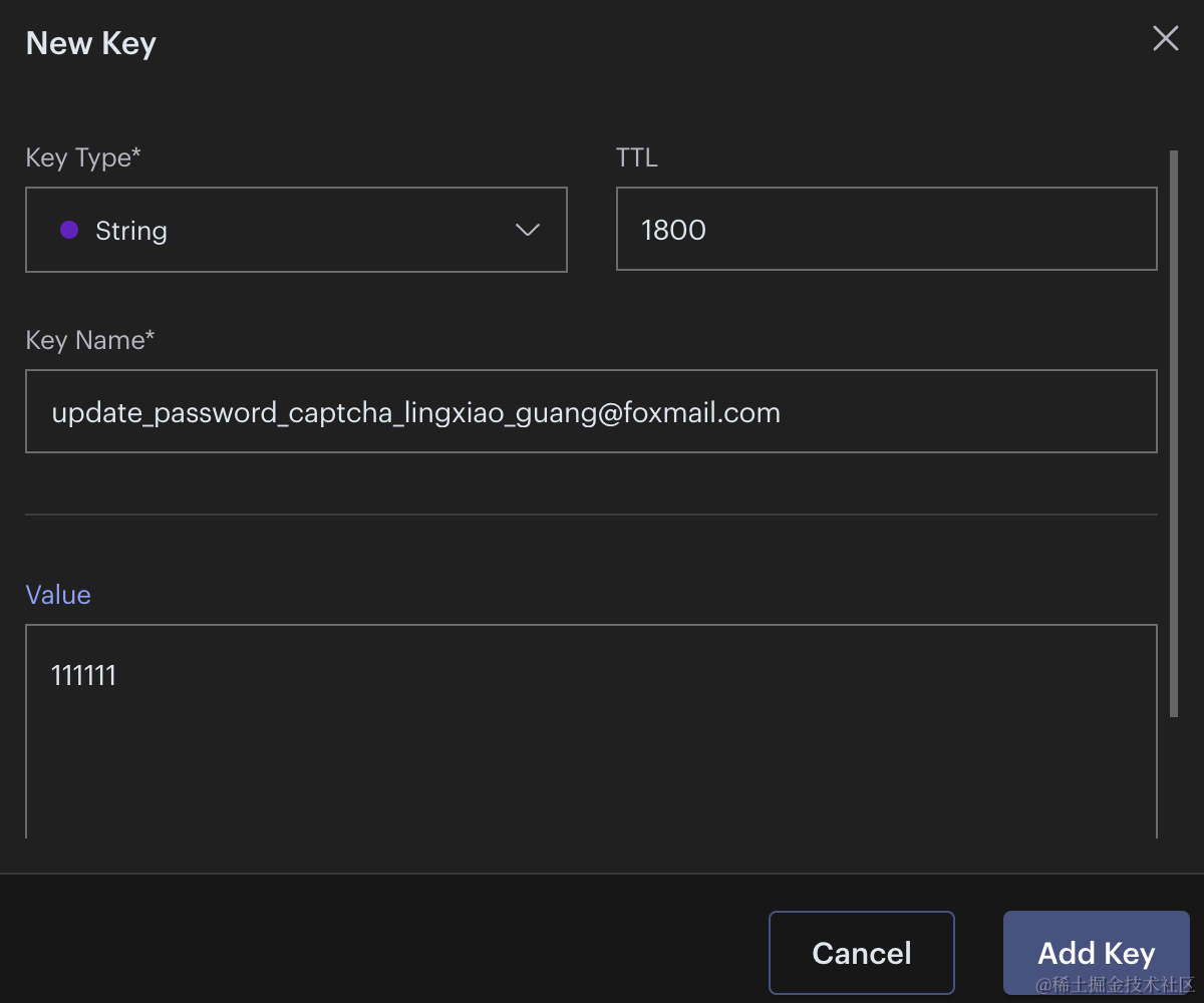 在 redis 里手动添加 update_password_captcha_邮箱 的 key,值为 111111