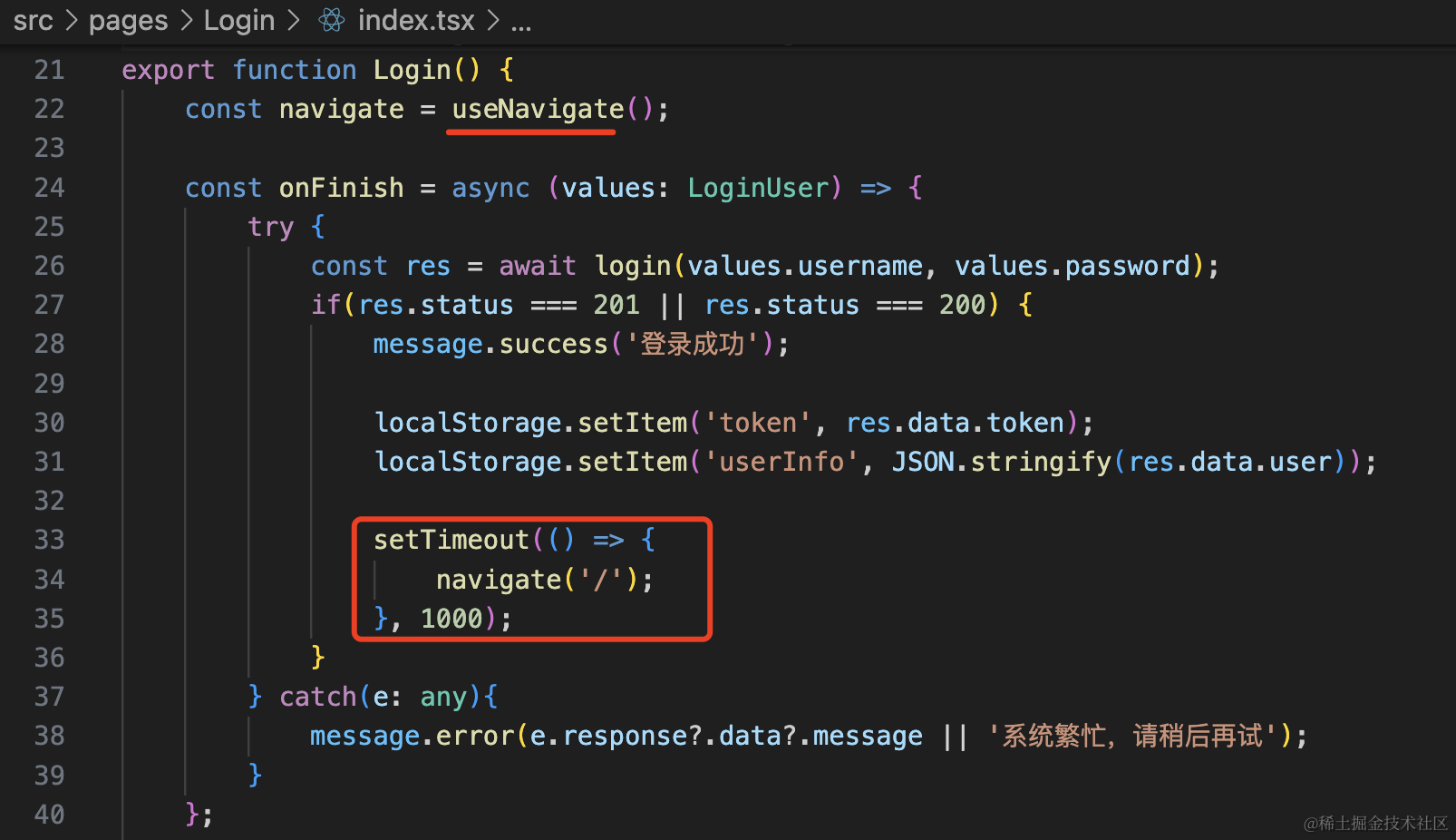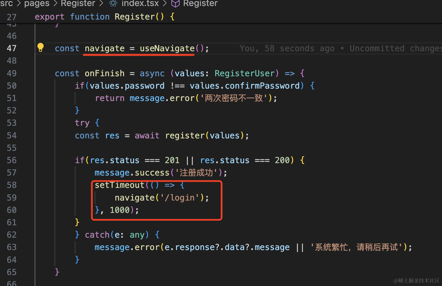 然后调用 useNavigate 的 navigate 方法,注册成功后导航到登录页:
