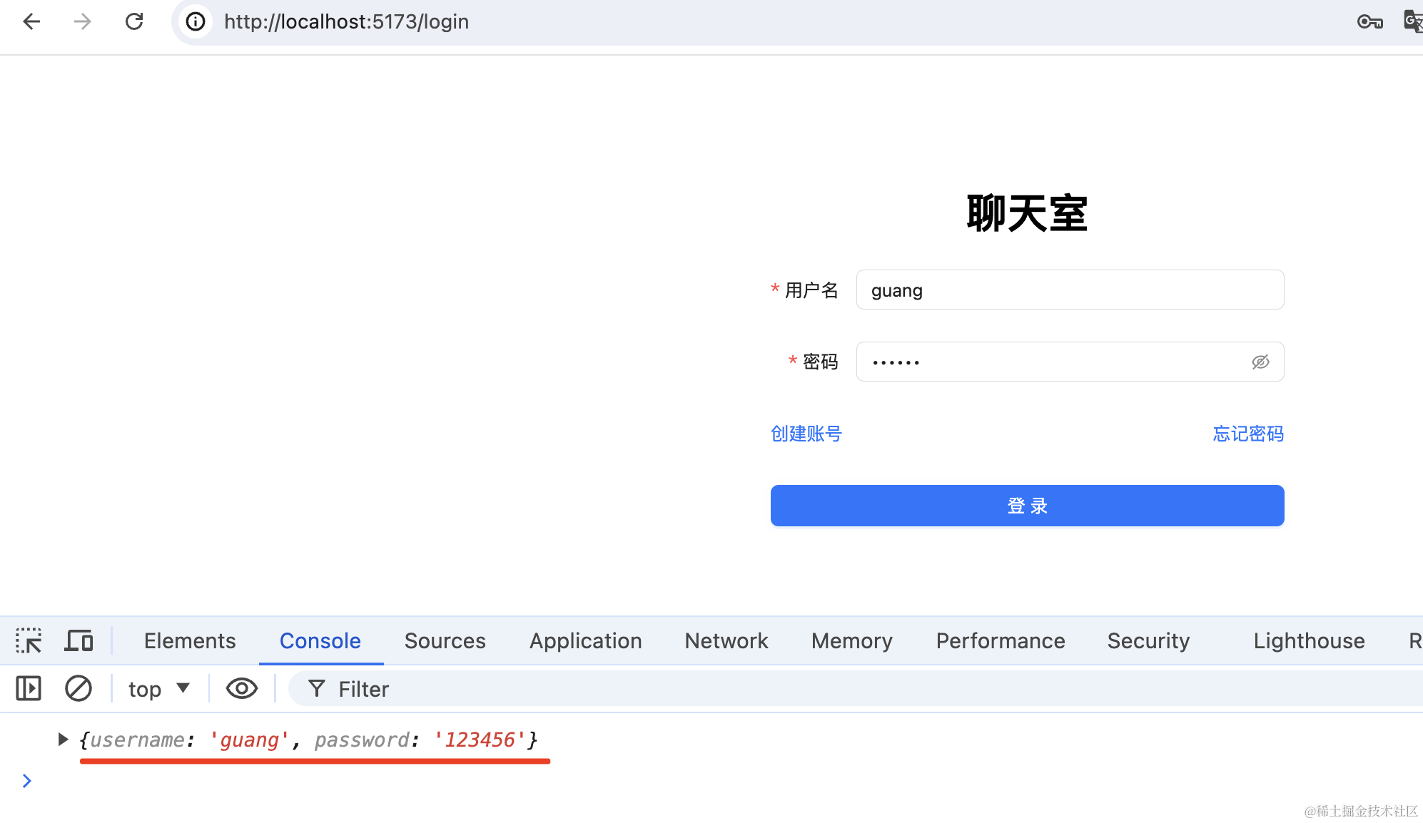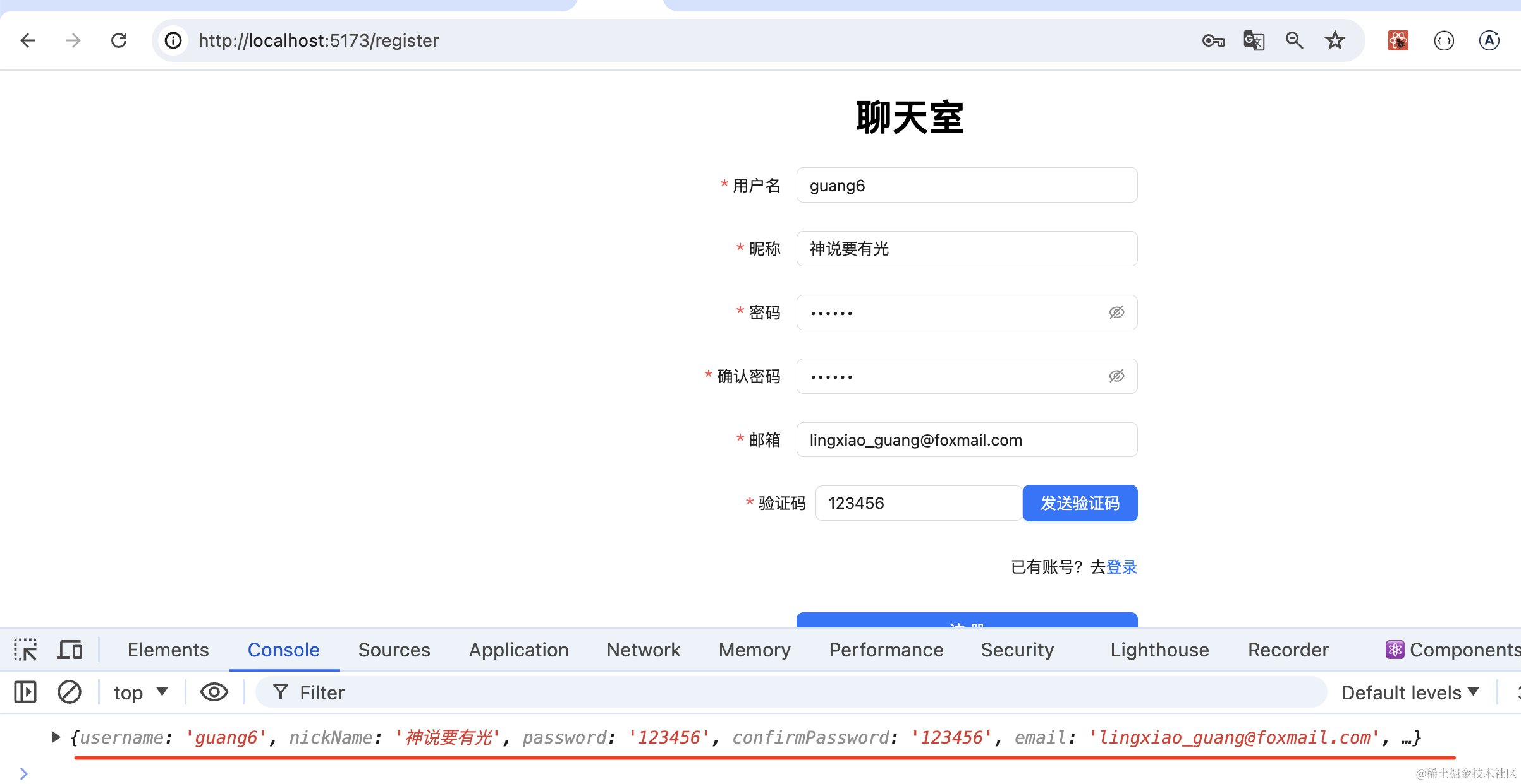 填入信息,点击注册,控制台会打印表单值: