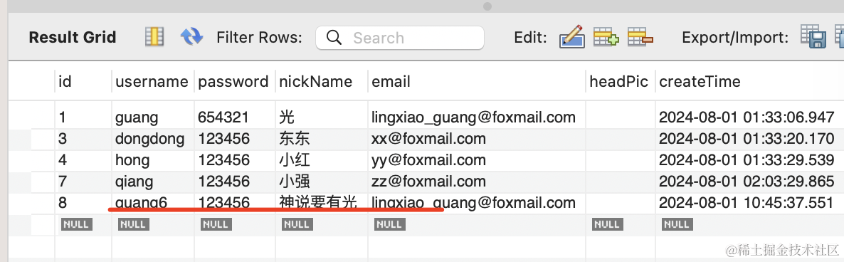 注册成功,数据库里也看到了这条记录: