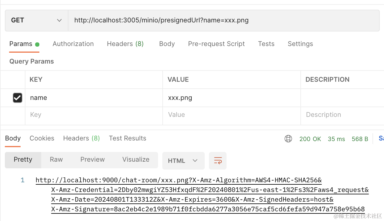 可以看到,返回了 xxx.png 的预签名的 url,这样前端不需要 accessKey 也可以用这个 url 来上传文件到 minio 了。