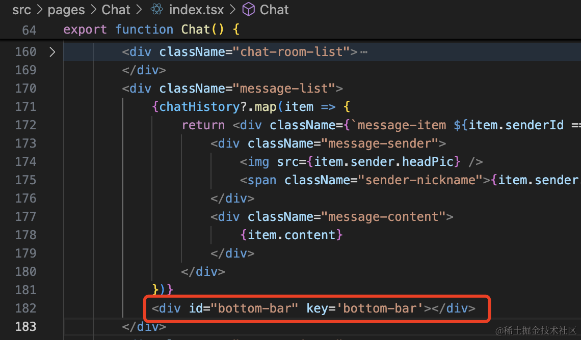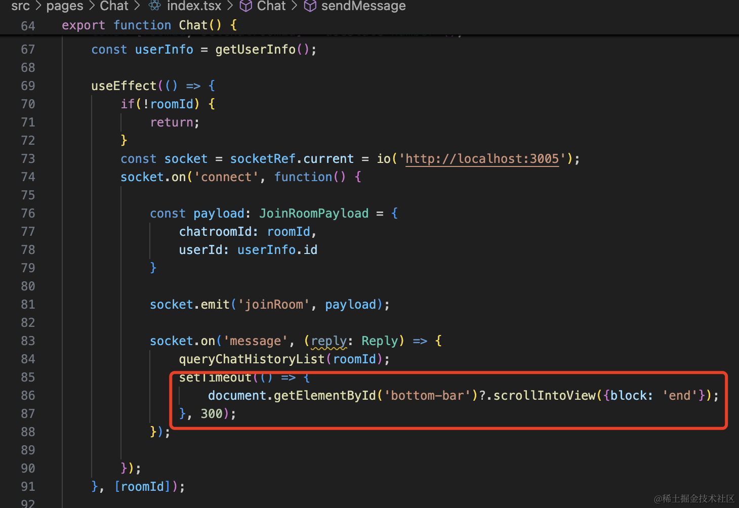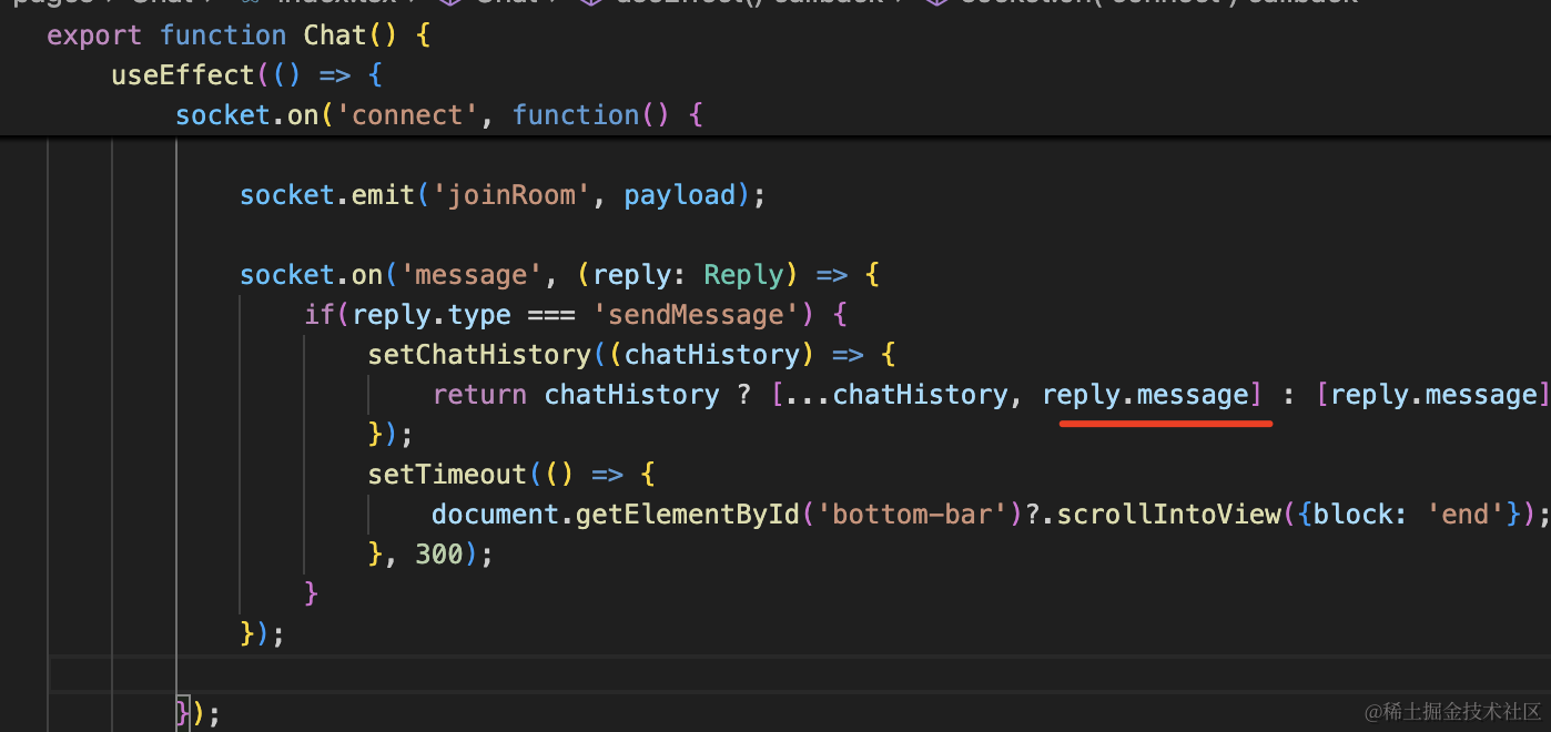 监听服务端的 message 消息,有新消息的时候添加到聊天记录里,并通过 scrollIntoView 滚动到底部。