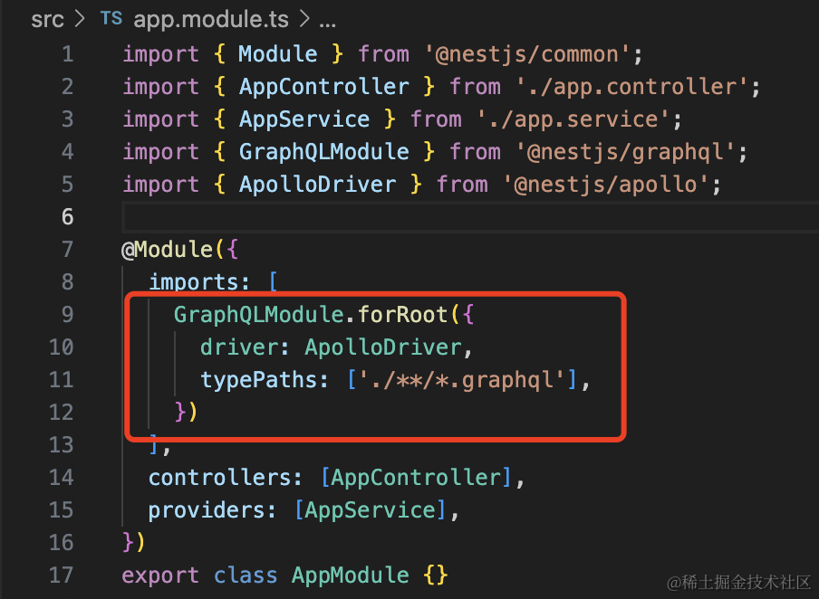 GraphQLModule.forRoot 指定 typePaths 也就是 schema 文件的位置。