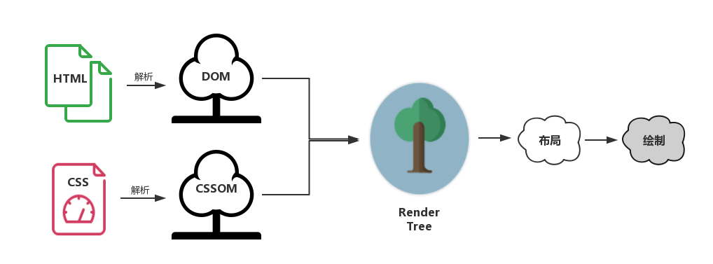 渲染过程说白了,首先是基于 HTML 构建一个 DOM 树,这棵 DOM 树与 CSS 解释器解析出的 CSSOM 相结合,就有了布局渲染树。最后浏览器以布局渲染树为蓝本,去计算布局并绘制图像,我们页面的初次渲染就大功告成了。