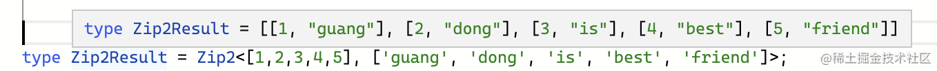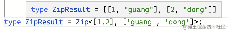 type tuple = [[1, 'guang'], [2, 'dong']];思路很容易想到,提取元组中的两个元素,构造成新的元组: