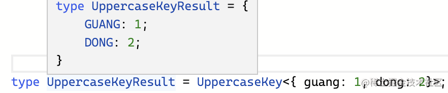 通过 Uppercase 把索引 Key 转为大写,因为索引可能为 string、number、symbol 类型,而这里只能接受 string 类型,所以要 & string,也就是取索引中 string 的部分。