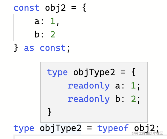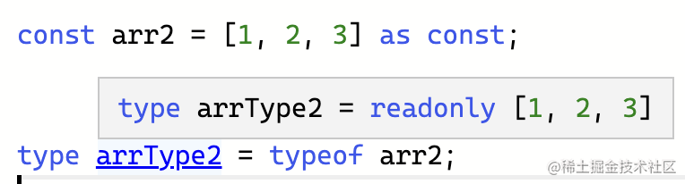 const 是常量的意思,也就是说这个变量首先是一个字面量值,而且还不可修改,有字面量和 readonly 两重含义。所以加上 as const 会推导出 readonly 的字面量类型。