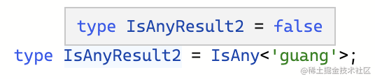 type IsAny<T> = 'dong' extends ('guang' & T) ? true : false这里的 ‘dong’ 和 ‘guang’ 可以换成任意两个不同的类型。