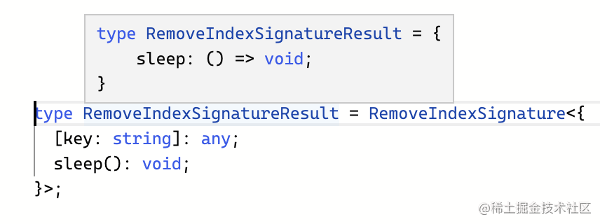 - 索引类型的索引为字符串字面量类型,而可索引签名不是,可以用这个特性过滤掉可索引签名。