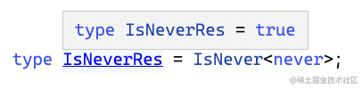 type IsNever<T> = [T] extends [never] ? true : false这样就能正常判断 never 类型了:
