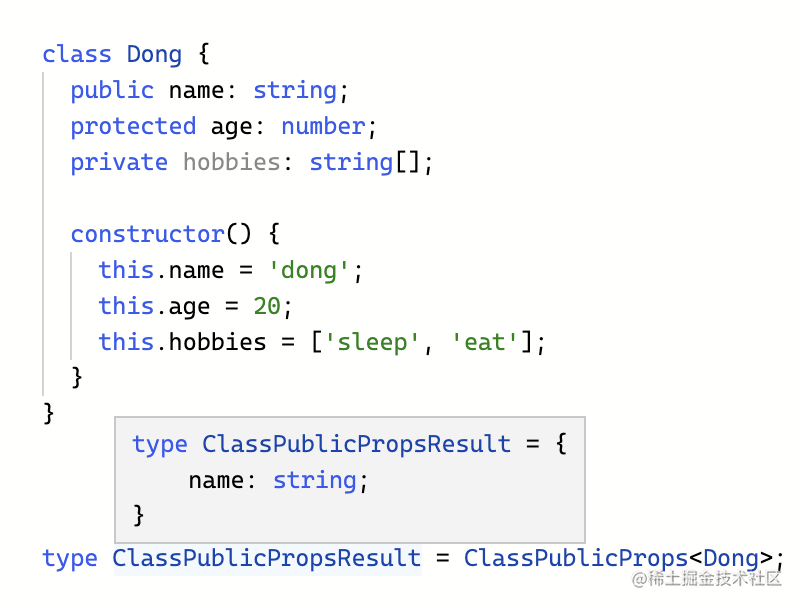 - keyof 只能拿到 class 的 public 的索引,可以用来过滤出 public 的属性。