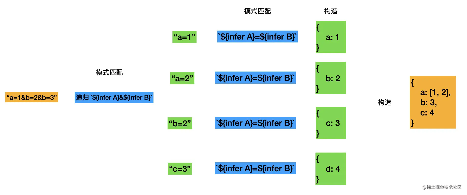在实现 ParseQueryString 的类型的时候,我们大量用到了模式匹配做提取、重新构造做变换、递归复用做循环这 3 大套路,思路理清之后利用这些套路能够很顺畅的把这个高级类型写出来。