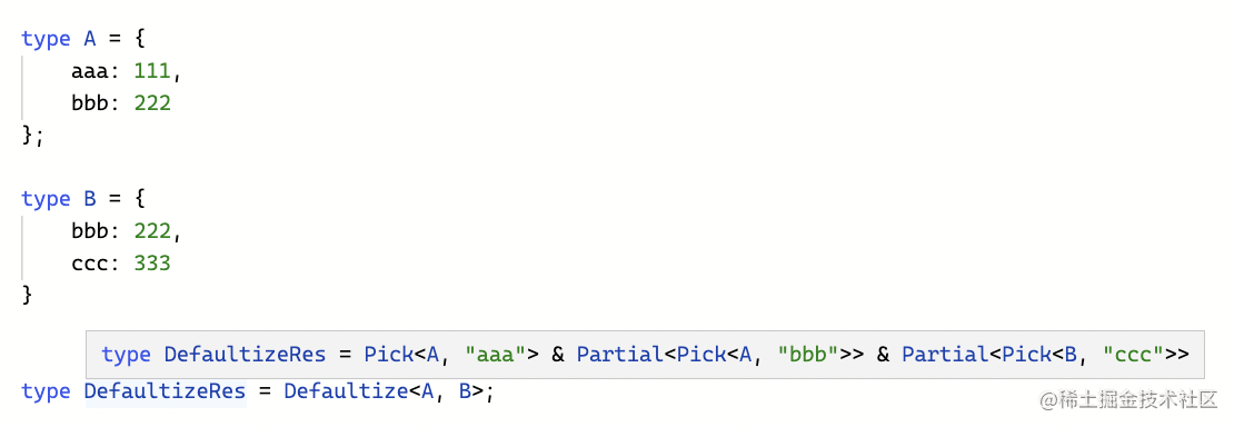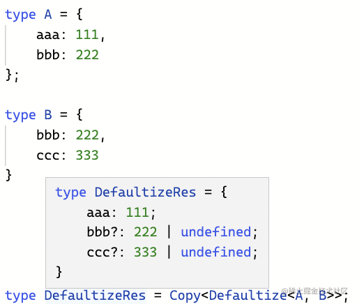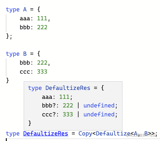 然后 Pick 出 A、B 都有的部分,也就是 Extract<keyof A, keyof B>。用 Partial 转为可选。