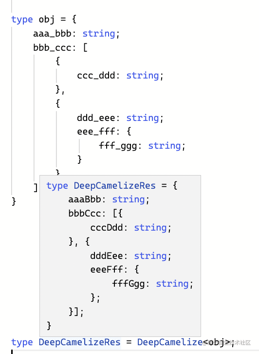 然后我们又实现了 DeepCamelize,递归的处理索引类型,把 Key 转为 CamelCase 的形式,比较综合的案例。