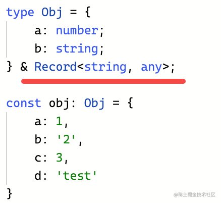 } & Record<string, any>;定义一个 DeepRecord 的高级类型,传入的类型参数 Obj 为一个索引类型,通过 Record<string, any> 约束。