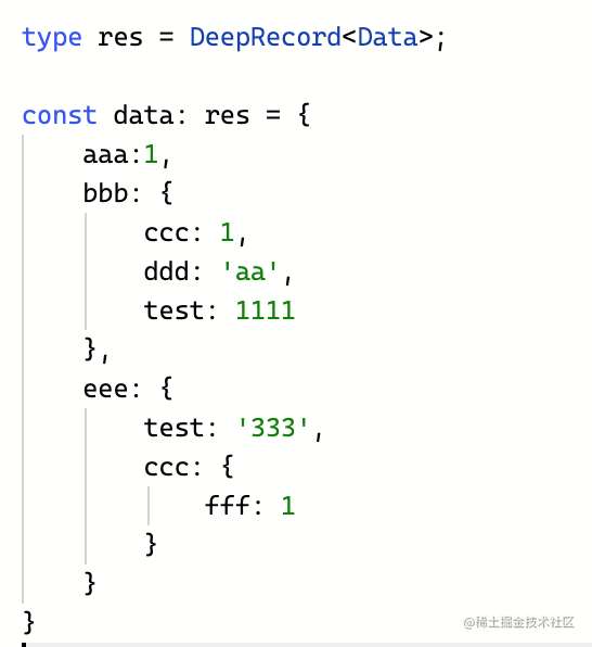 Value 要判断是不是索引类型,如果依然是 Record<string, any>,那就递归处理它的值 Obj[Key],否则直接返回 Obj[Key]。