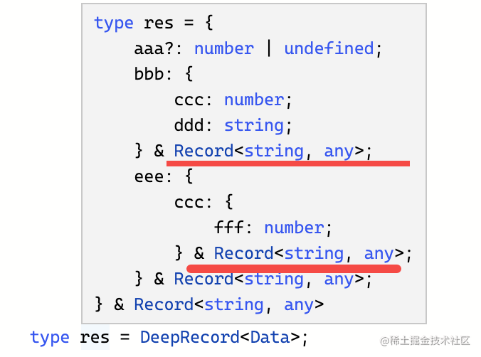 可以看到,处理过后的类型确实是每一层都加上了 Record<string, any>。