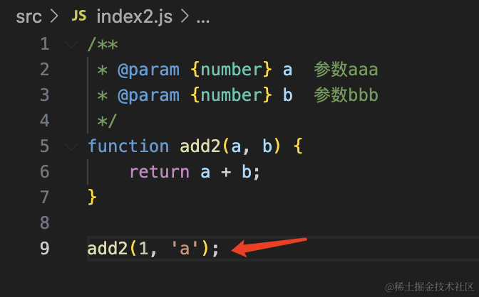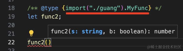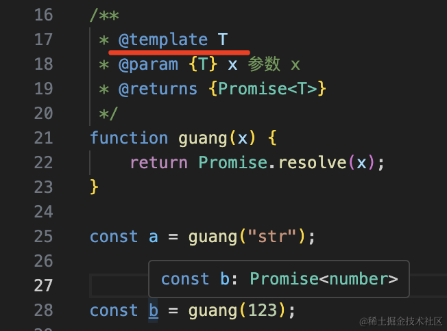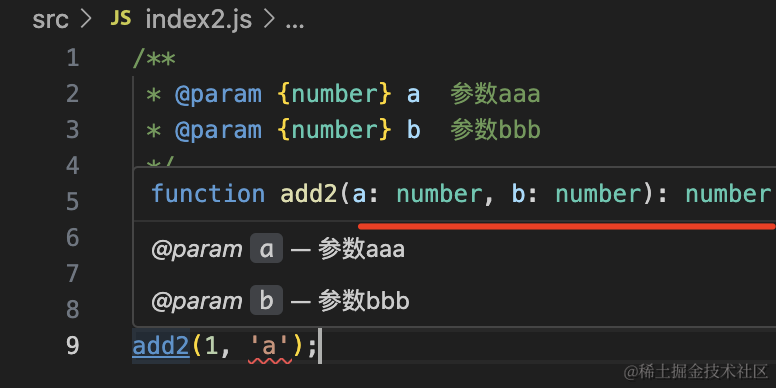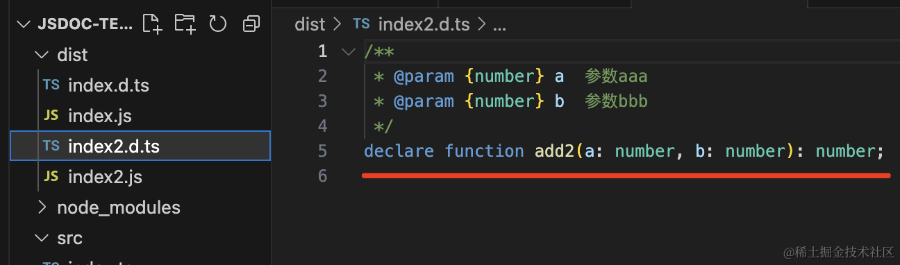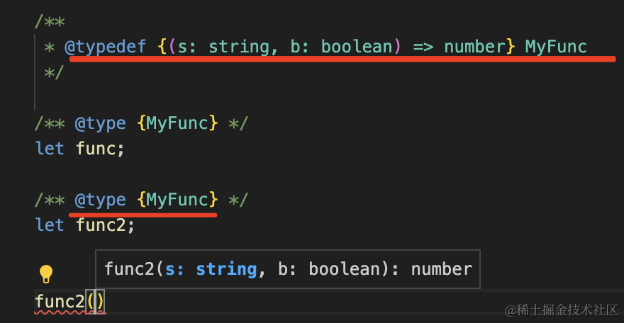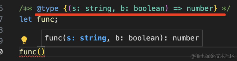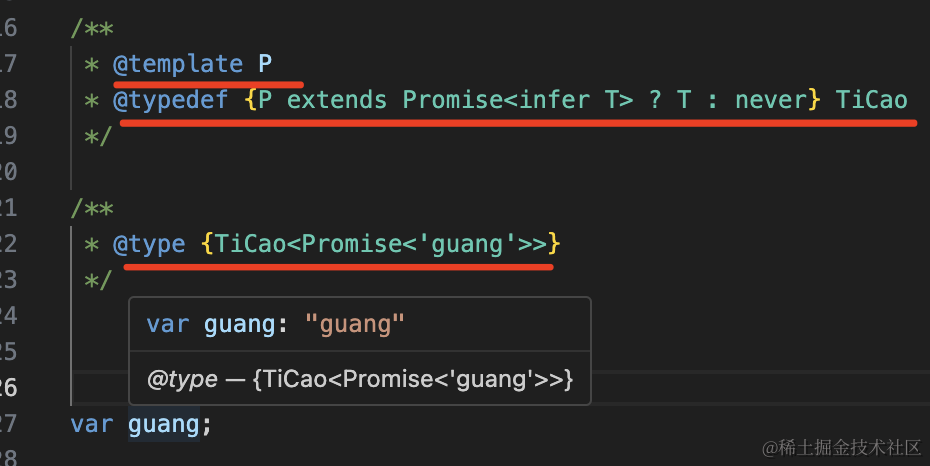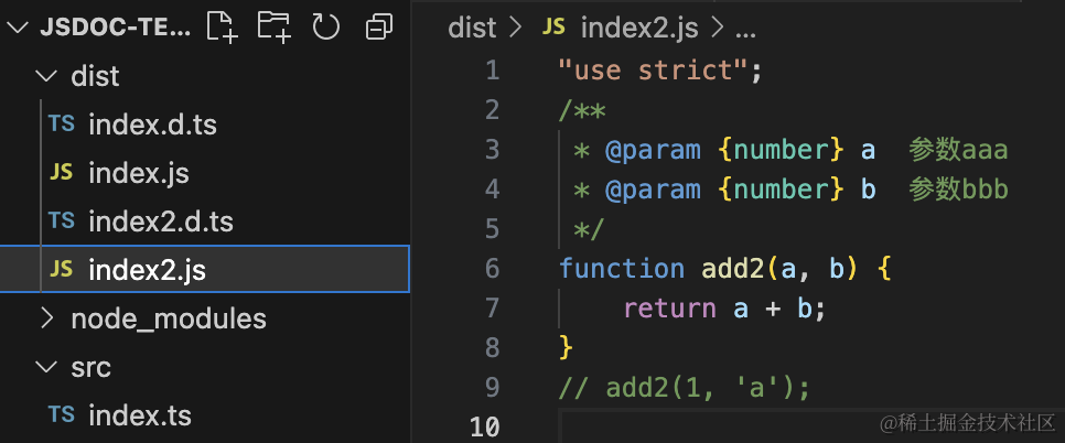 注意,这可不是用 ts 语法声明的类型,而是用 JSDoc 写的。
