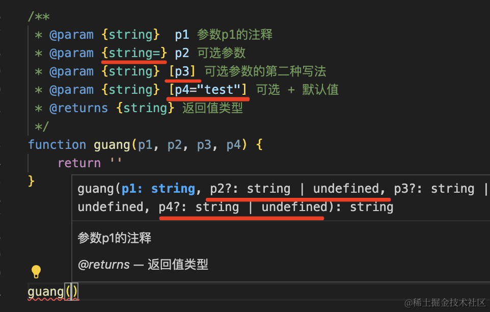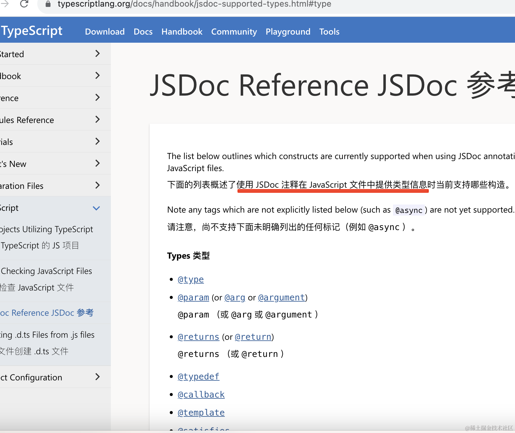 但我们说的 JSDoc 并不是这个,而是 TS 基于 JSDoc 语法实现的,在注释里给代码添加类型的语法。