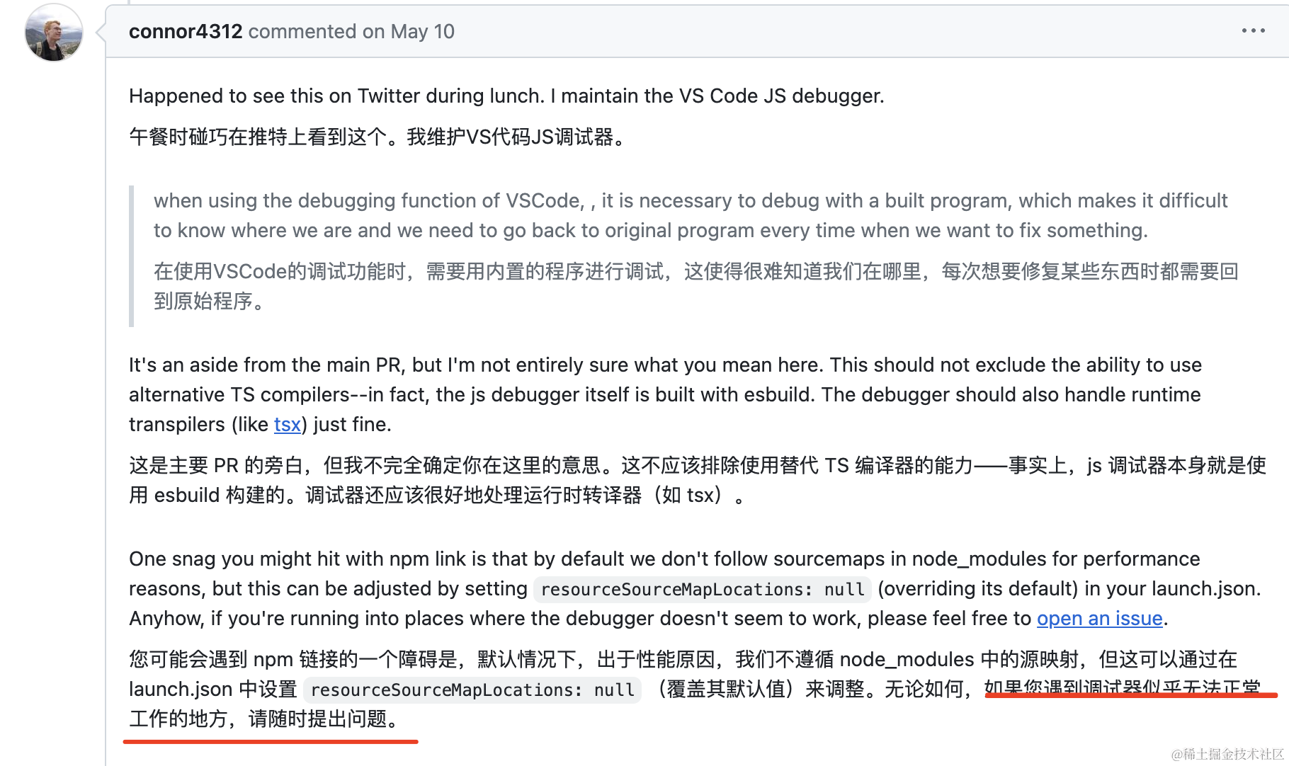 然后下面还有个 VSCode 调试器的维护者评论说,有任何调试相关的问题可以找我:
