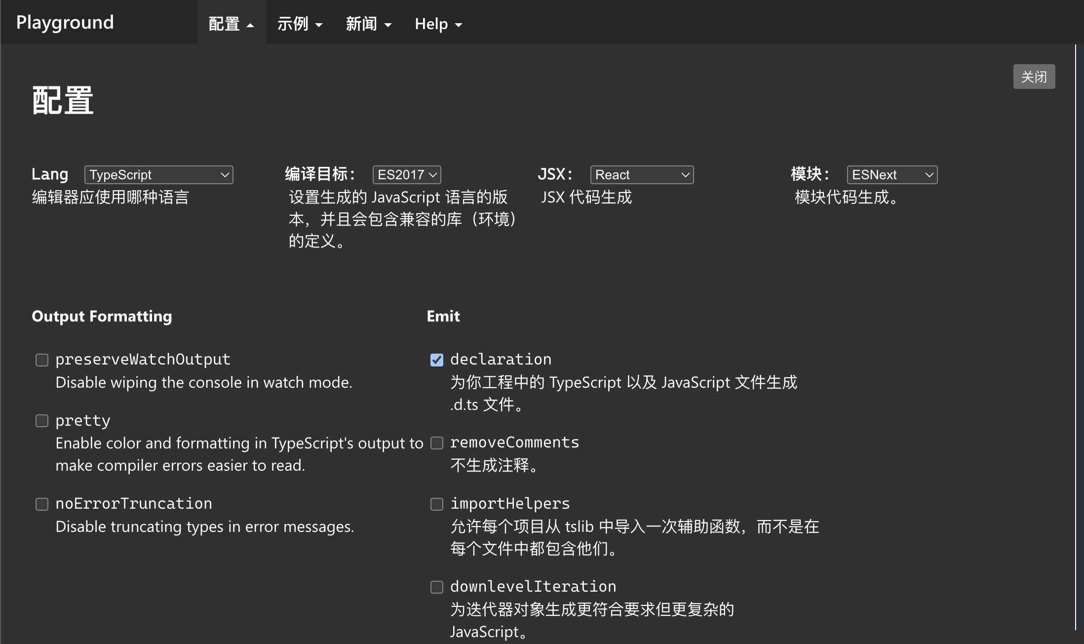Playground 最强大的能力其实在于,支持非常简单的配置切换,如 TS 版本(左上角 ),以及通过可视化的方式配置 tsconfig (左上角的配置)等,非常适合在这里研究 tsconfig 各项配置的作用。