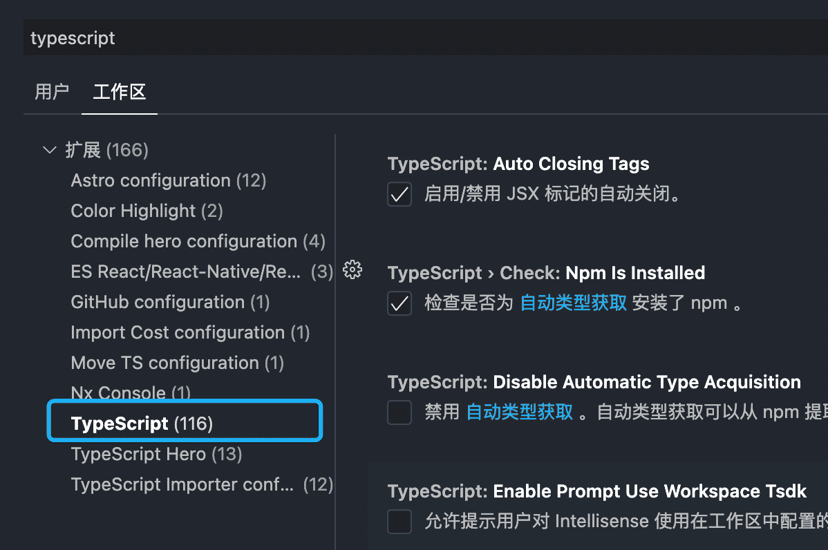然后,在打开的设置中输入 typescript,筛选出所有 TypeScript 有关的配置,点击左侧的"TypeScript",这里才是官方内置的配置。