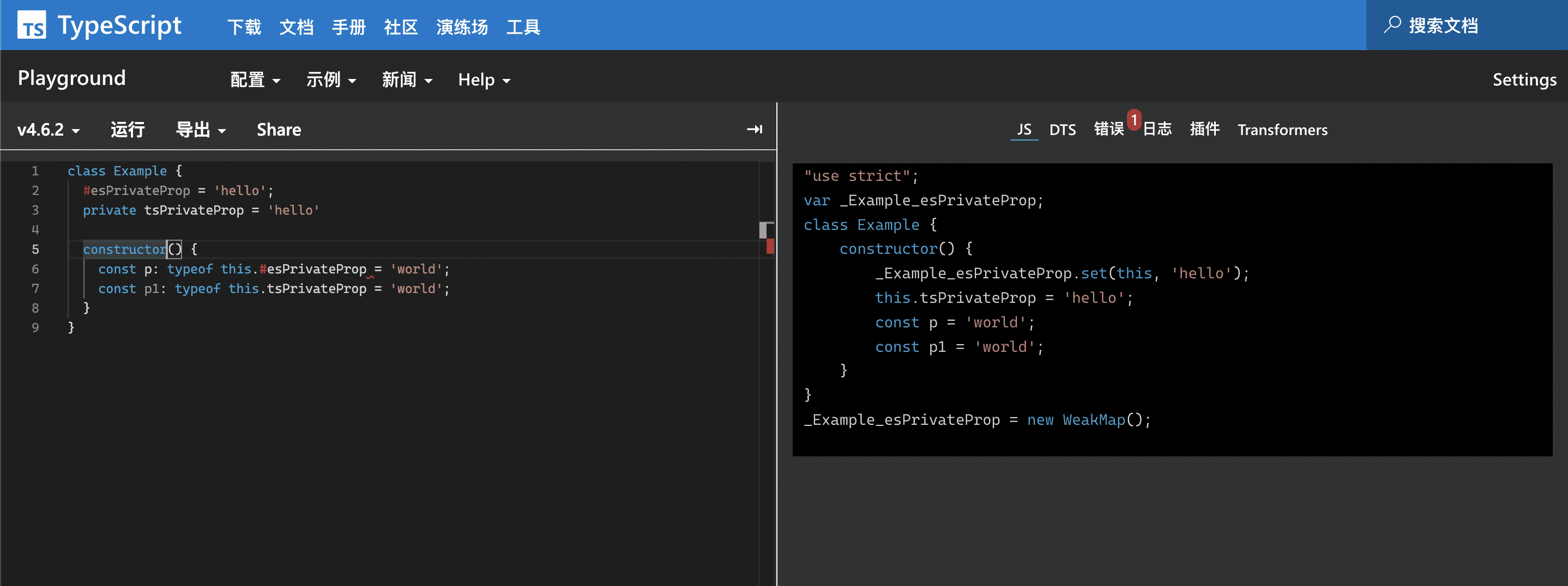 你可以在这里编写 TS 代码,快速查看编译后的 JS 代码与声明文件,还可以通过 Shift + Enter 来执行 TS 文件。可以说,如果不需要 VS Code 更强大的提示能力与一些特殊插件、主题等,Demo 学习使用 Playground 真的够够的了。