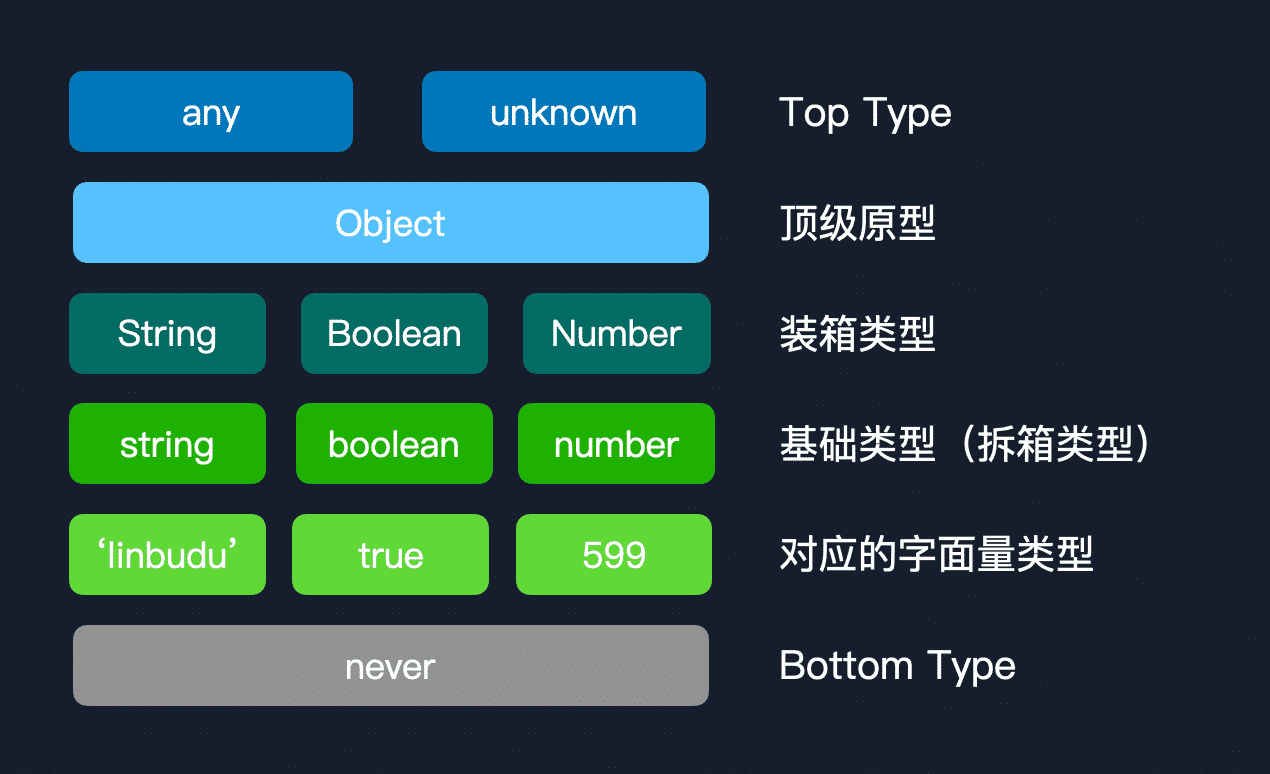 接下来,我们就从这个原始类型与字面量出发,向上、向下去探索类型层级。