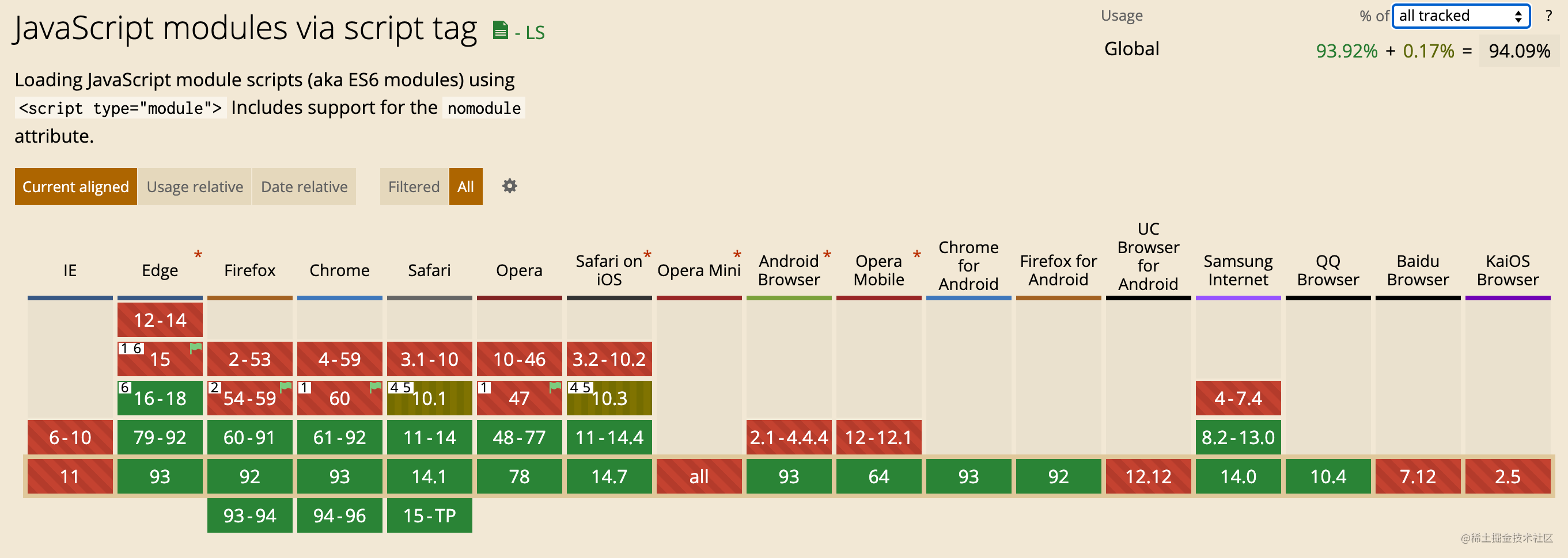 大家可能会担心 ES Module 的兼容性问题,其实 ES Module 的浏览器兼容性如今已经相当好了,覆盖了 90% 以上的浏览器份额,在 CanIUse 上的详情数据如下图所示: