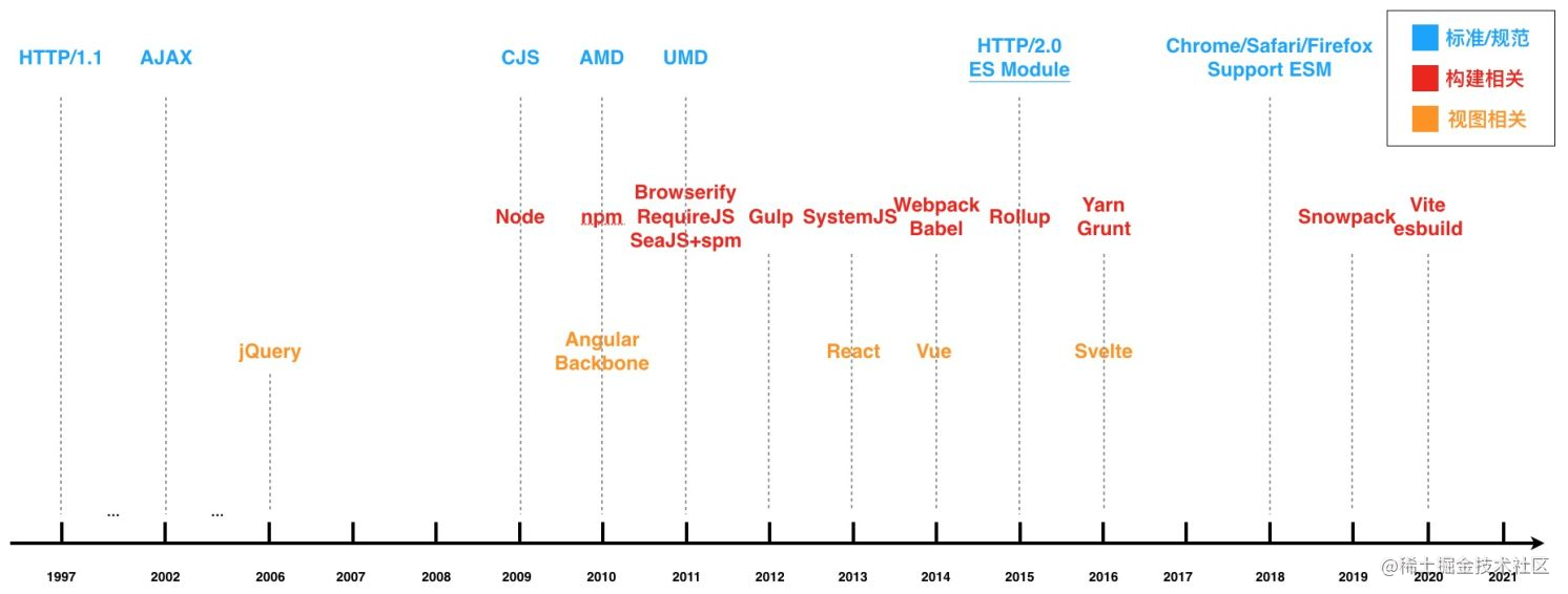 2002 年 AJAX 诞生至今,前端从刀耕火种的年代,经历了一系列的发展,各种标准和工具百花齐放。下图中我们可以看到,自 2009 年 Node.js 诞生,前端先后出现了 CommonJS、AMD、CMD、UMD和ES Module 等模块规范,底层规范的发展催生出了一系列工具链的创新,比如 AMD 规范提出时社区诞生的模块加载工具requireJS,基于 CommonJS 规范的模块打包工具browserify,还有能让用户提前用上 ES Module 语法的 JS 编译器Babel、兼容各种模块规范的重量级打包工具Webpack以及基于浏览器原生 ES Module 支持而实现的 no-bundle 构建工具 Vite 等等。